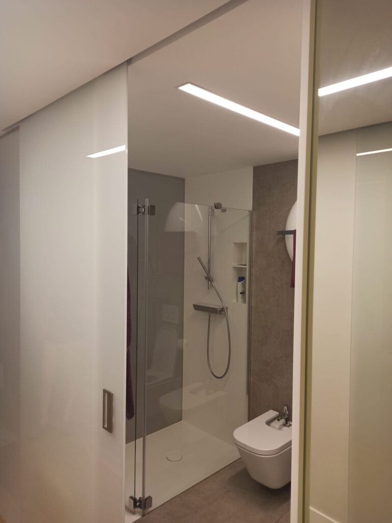El cubo de cristal del baño tiene un atractivo visual y decorativo muy interesante al entrar al dormitorio. Además de ello al tener sus paredes de cristal deja entrar la luz al baño y conseguimos luz natural que no tenemos en esa zona y tanto nos gusta. Los colores y materiales utilizados van acordes con el resto de la estancia consiguiendo así una unión del conjunto.