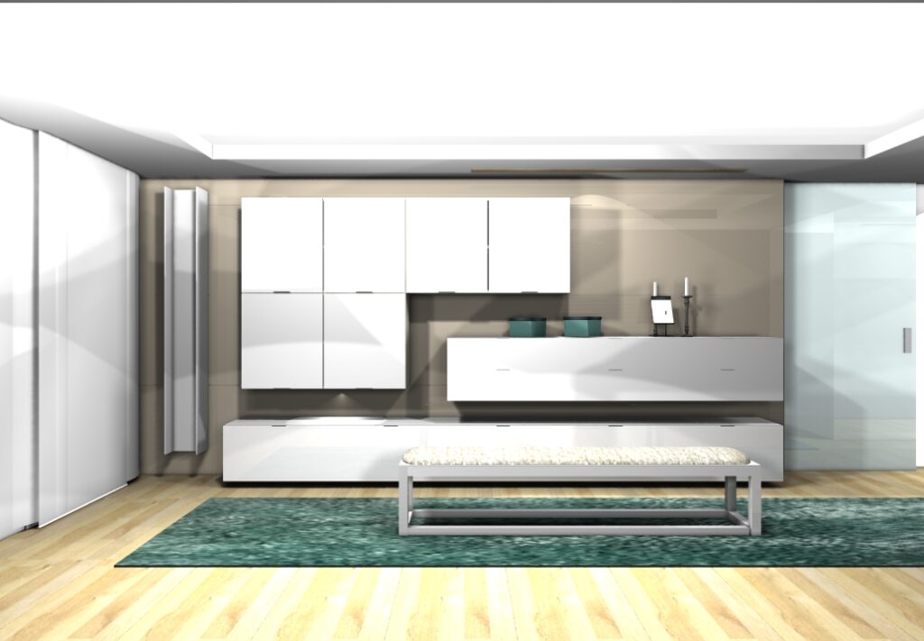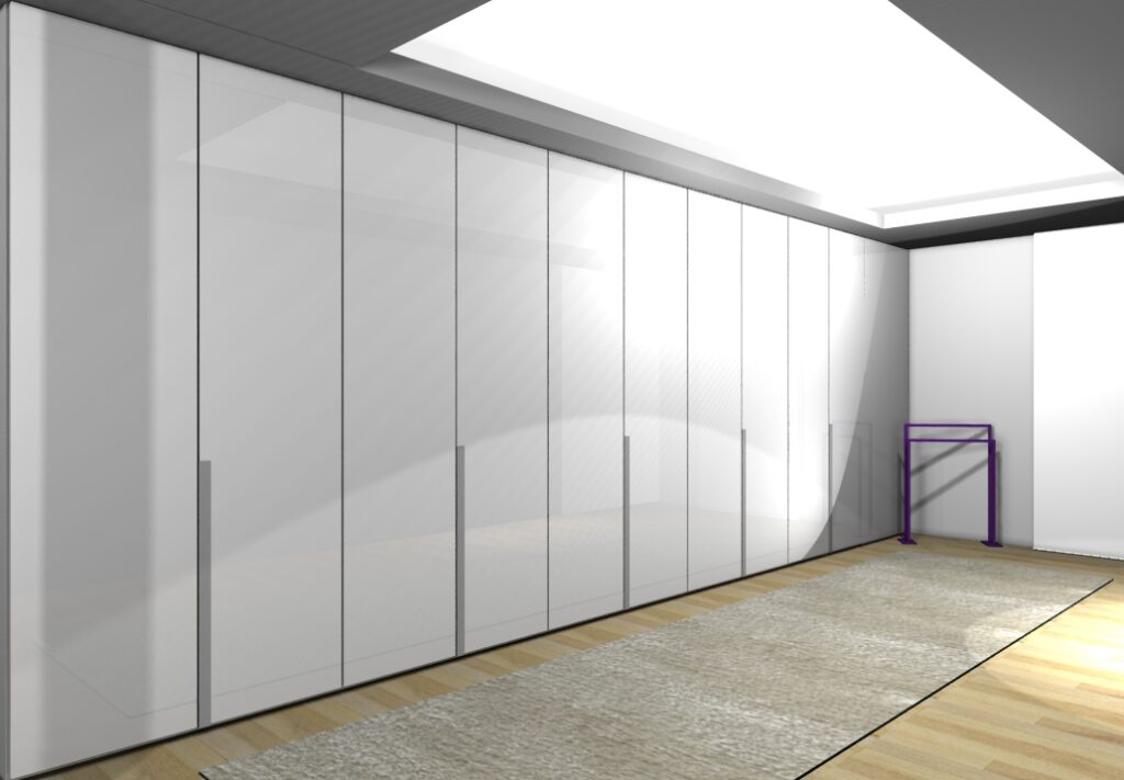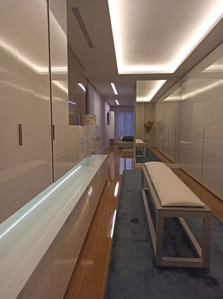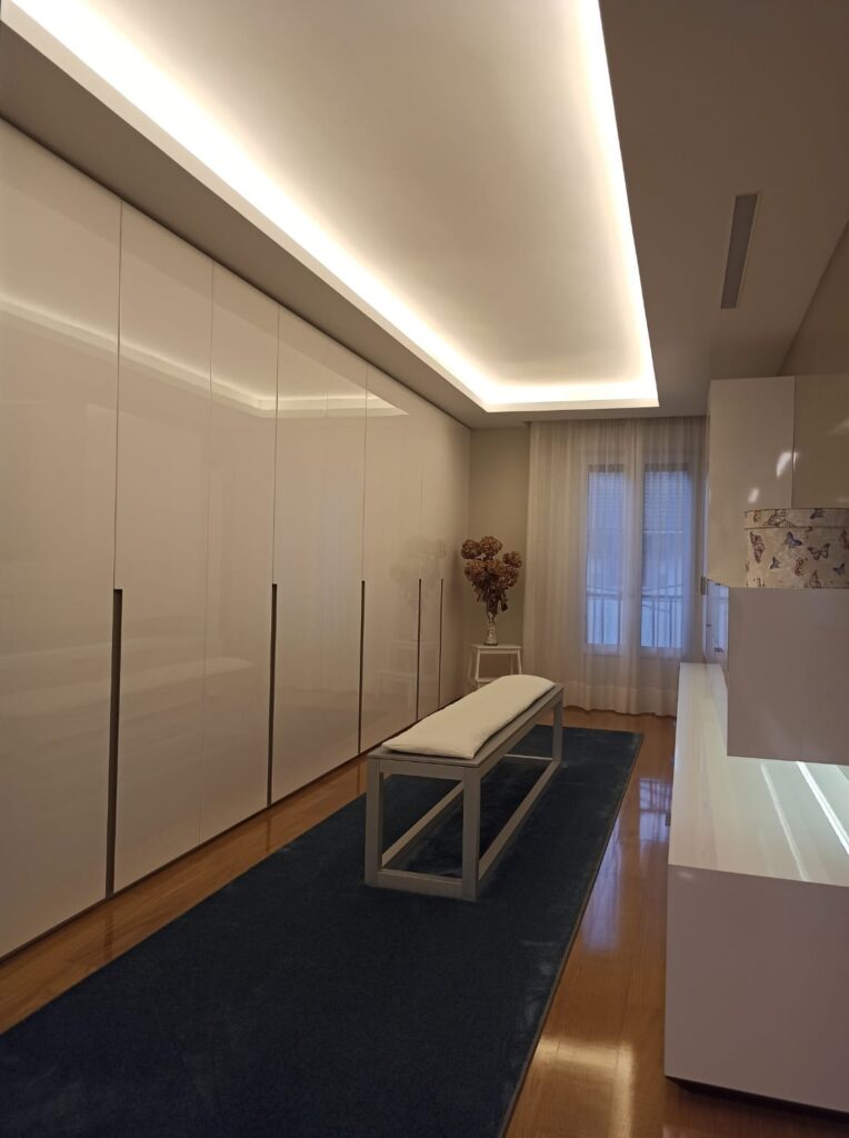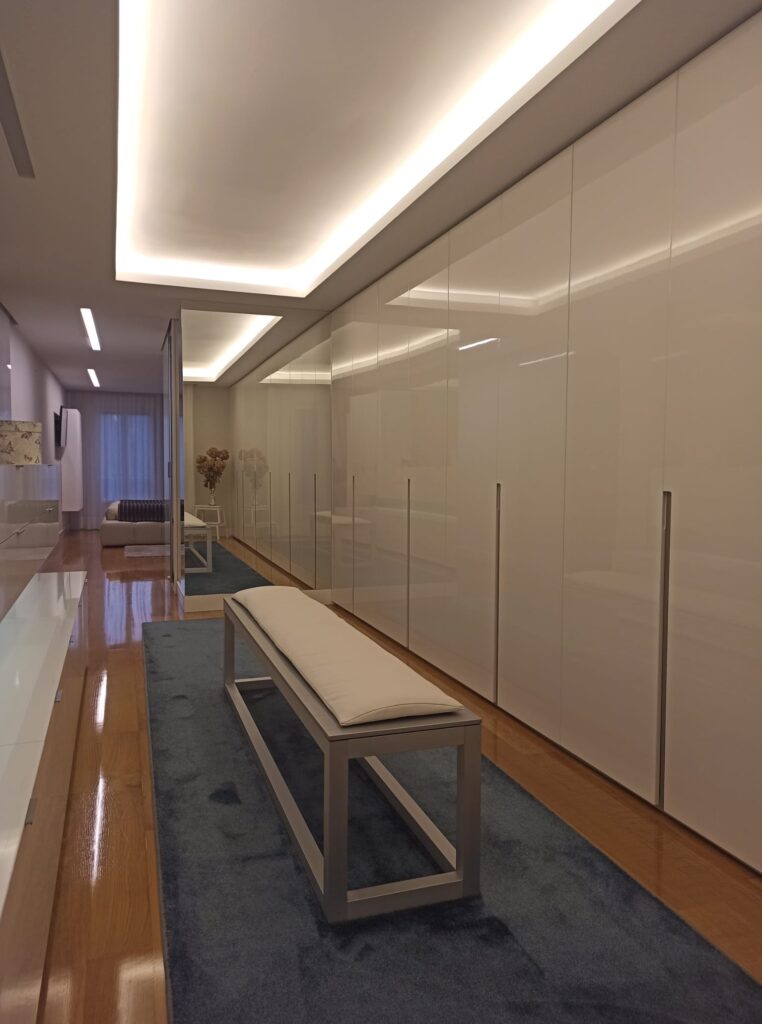 La zona del vestidor cuenta con un equipamiento completo muy estudiado de armarios y cajones. Consiguiendo así satisfacer todas las necesidades del cliente. El color elegido para los armarios es blanco brillo que al reflejar todo por su acabado conseguimos la sensación de amplitud y luminosidad. Cuenta con un gran espejo de suelo a techo que forra la totalidad de una pared, donde también conseguimos el mismo efecto ahora nombrado además de ser un elemento muy útil e indispensable para esta zona.